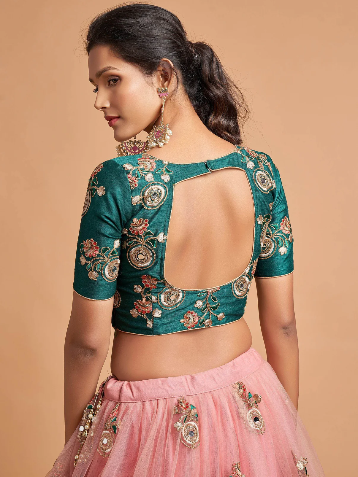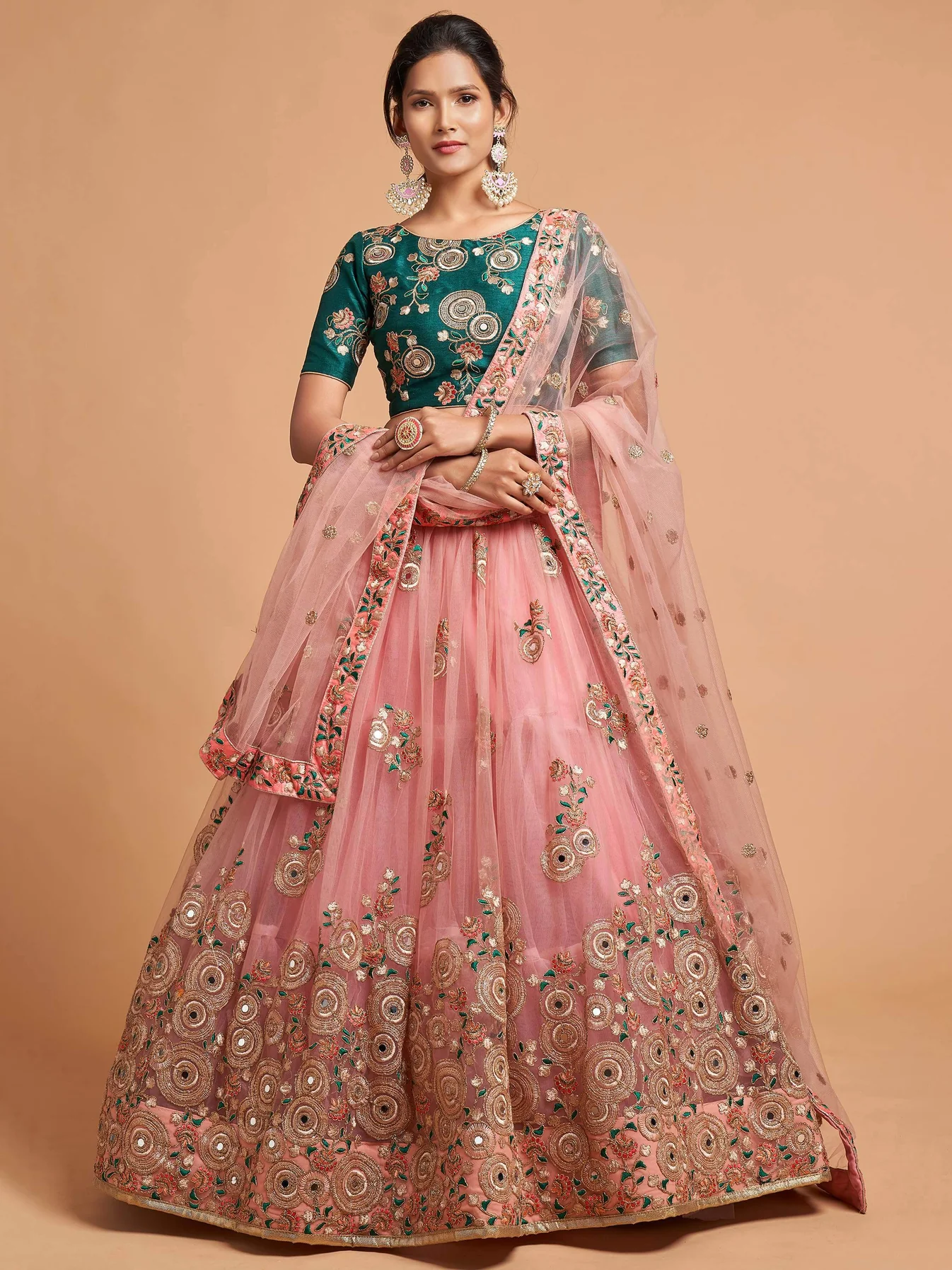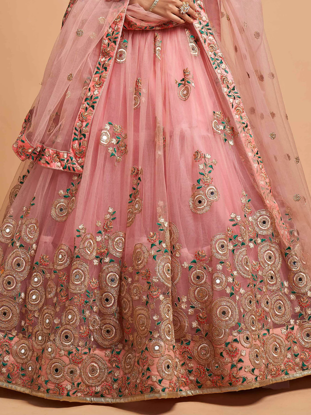 - Enhance your beauty with a vibrant burst of colors by wearing this elegant peach lehenga in soft net material embellished with zari, dori, thread, mirror, and sequins embroidery work attached can-can inside.