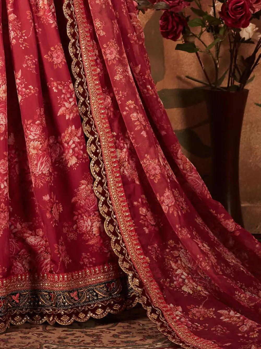 - The maroon lehenga, crafted from luxurious organza fabric, is adorned with a beautiful all-over floral print, complemented by intricate dori and sequin embroidery, along with a velvet lace border that adds a touch of sophistication.