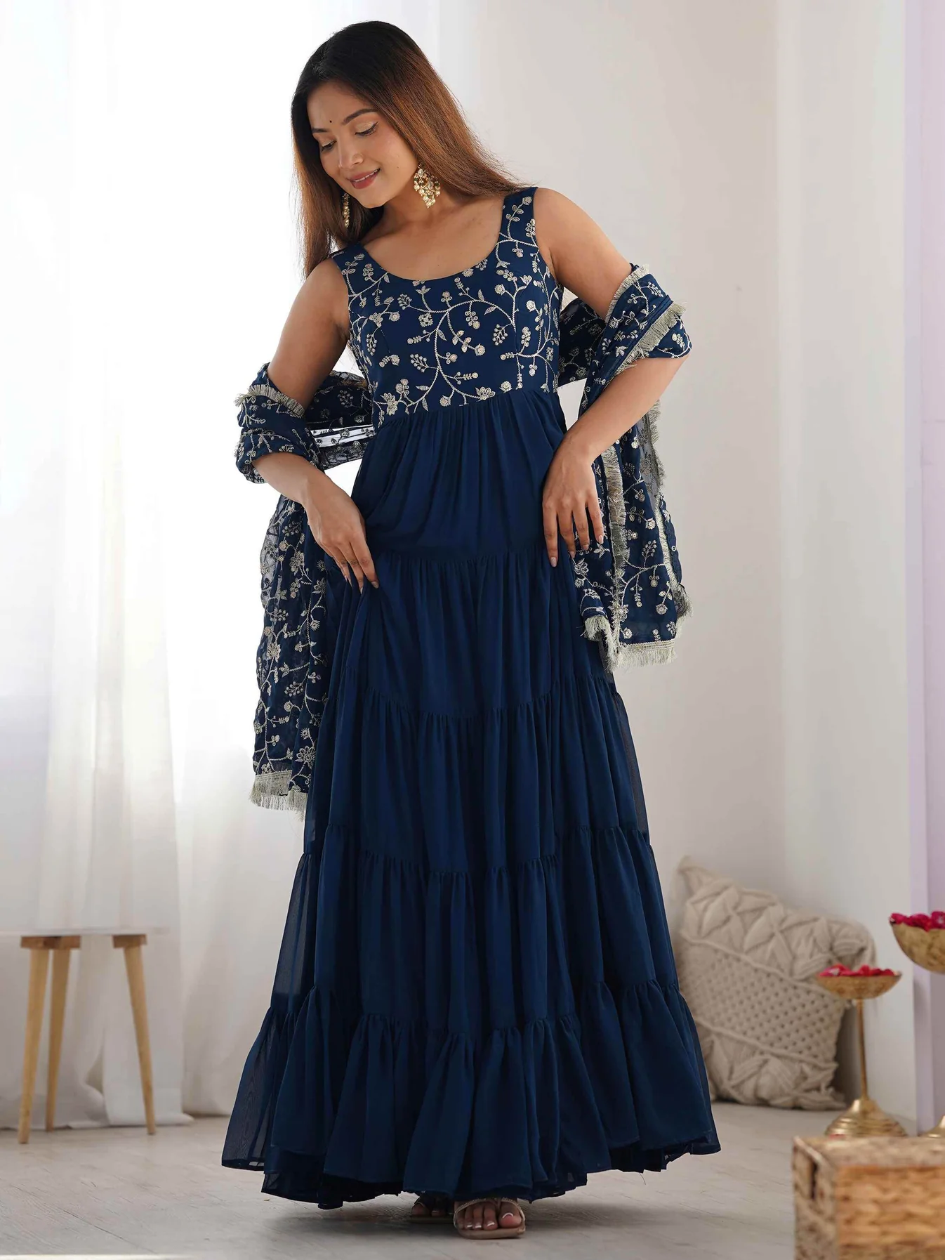 Be the first to review “Bewitching Teal Blue Embroidered Georgette Anarkali Gown With Dupatta”
