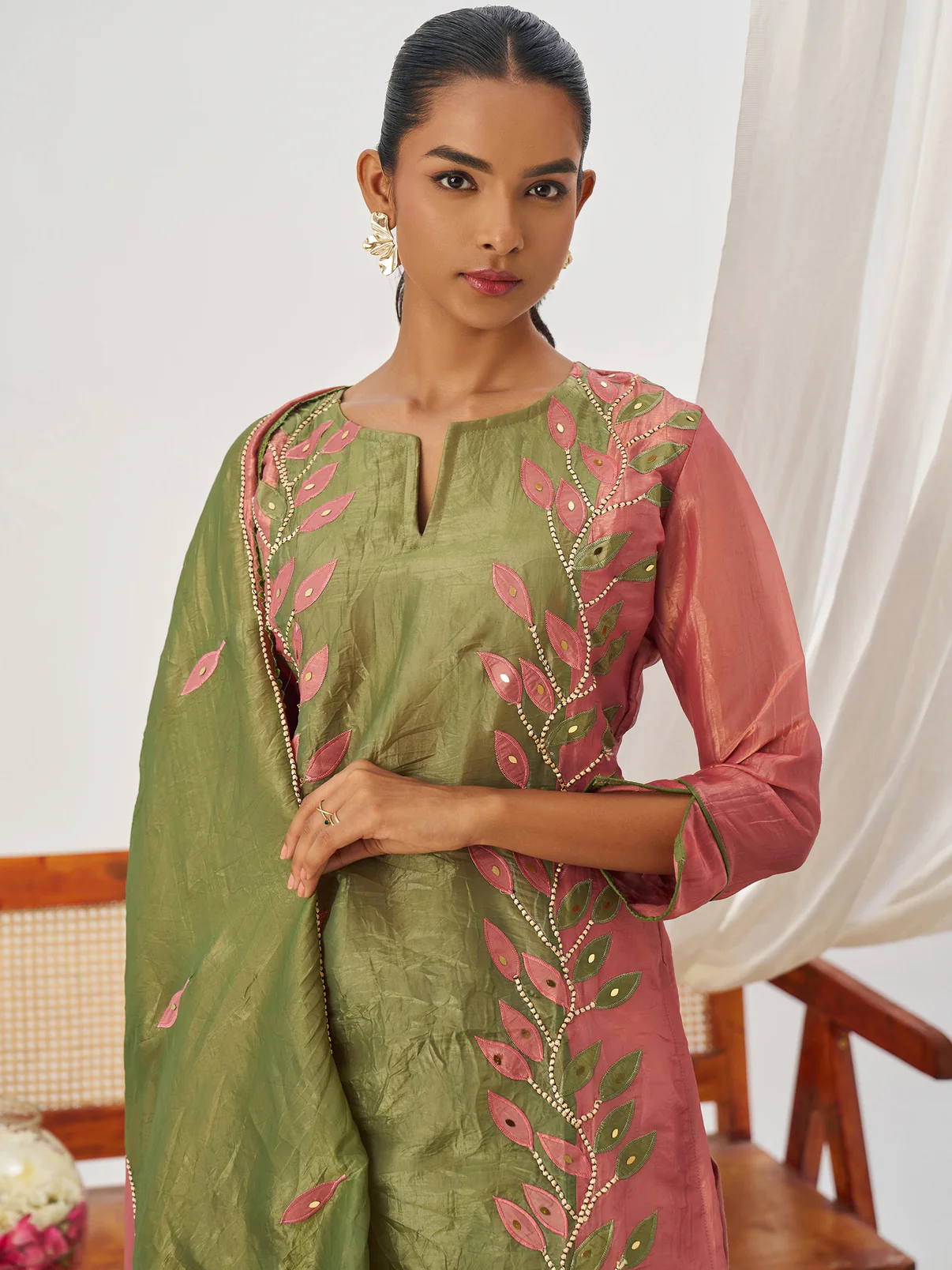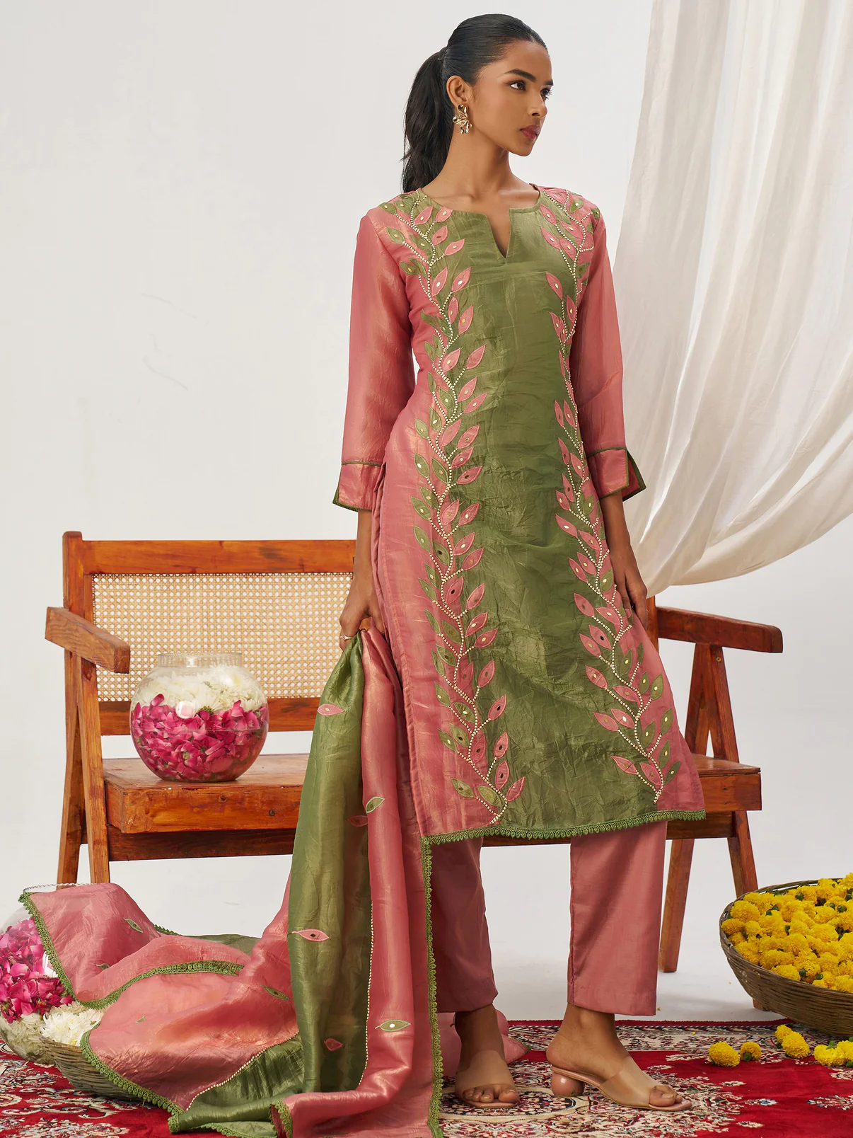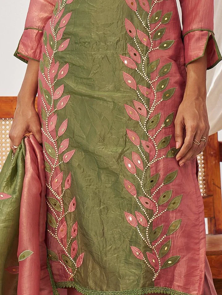 • The green and rose pink crush organza kurta, with a 42–43 inch length, features intricate leaf appliqué embroidery, mirror accents, and beadwork for a festive, elegant look.