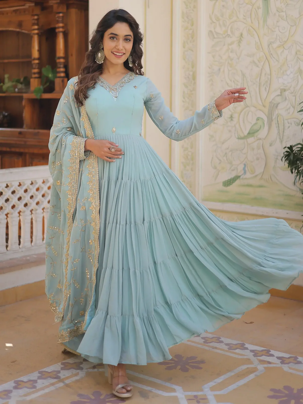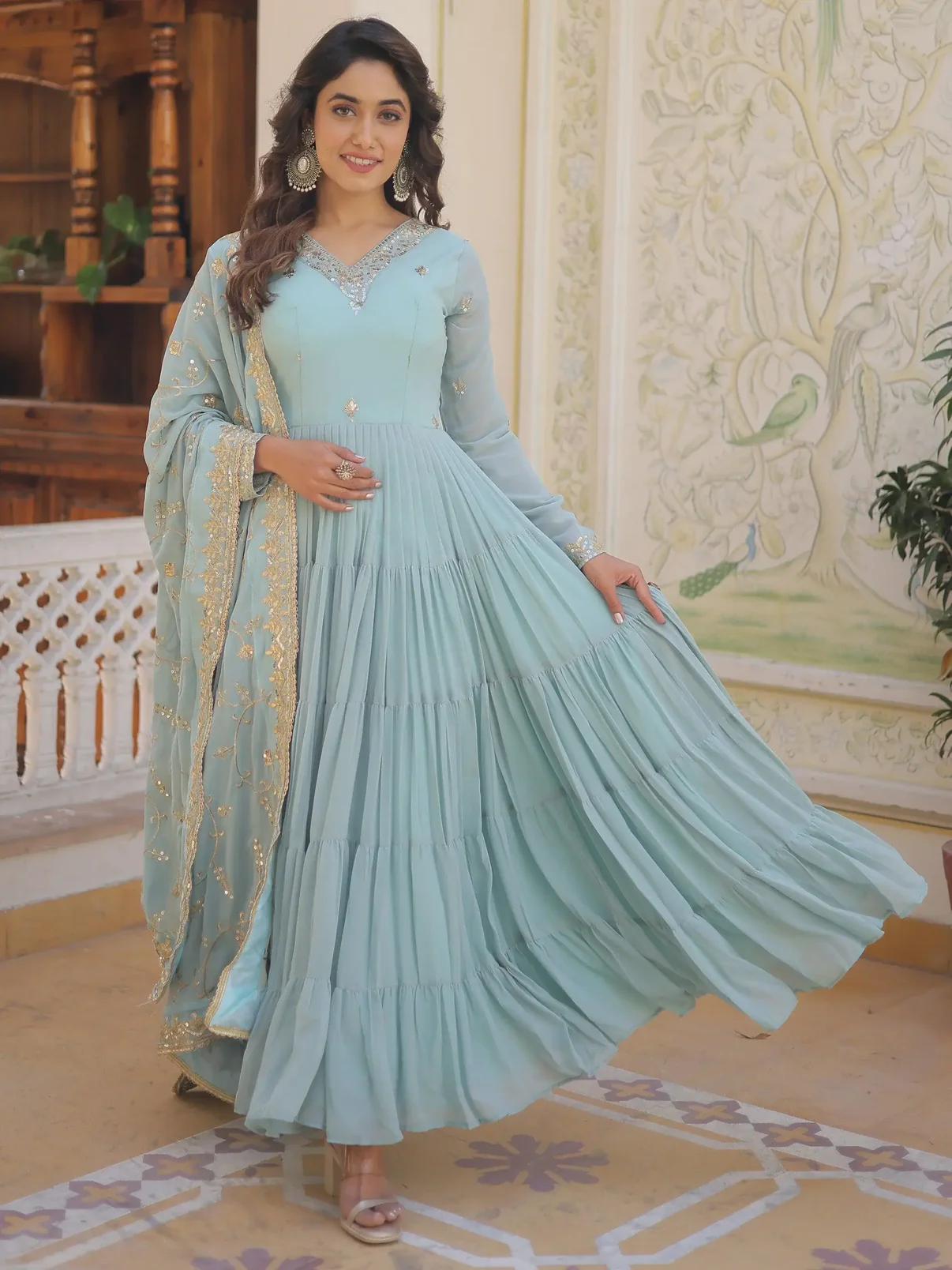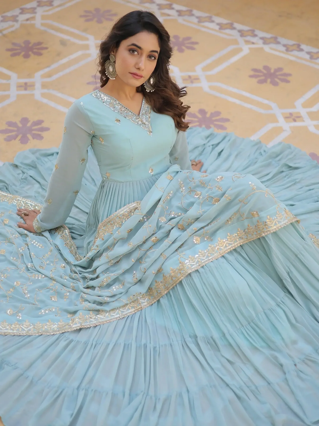 • This spectacular gown features a beautiful sky blue color georgette material with intricate 5-layer ruffle work and sequin detailing.