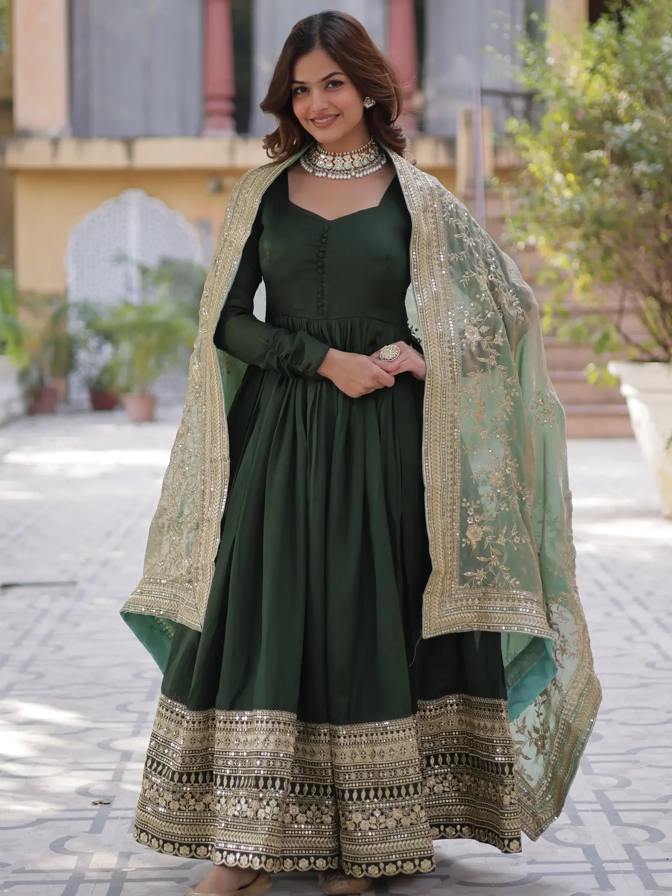 Fabulous Green Zari Work Vichitra Silk Festive Wear Gown With Dupatta