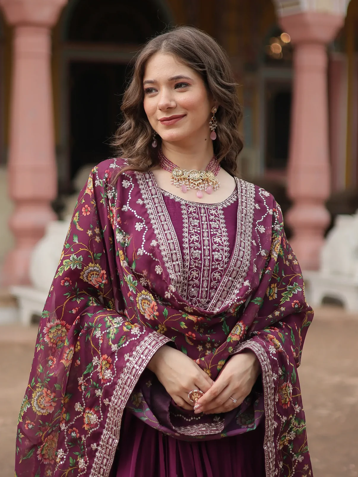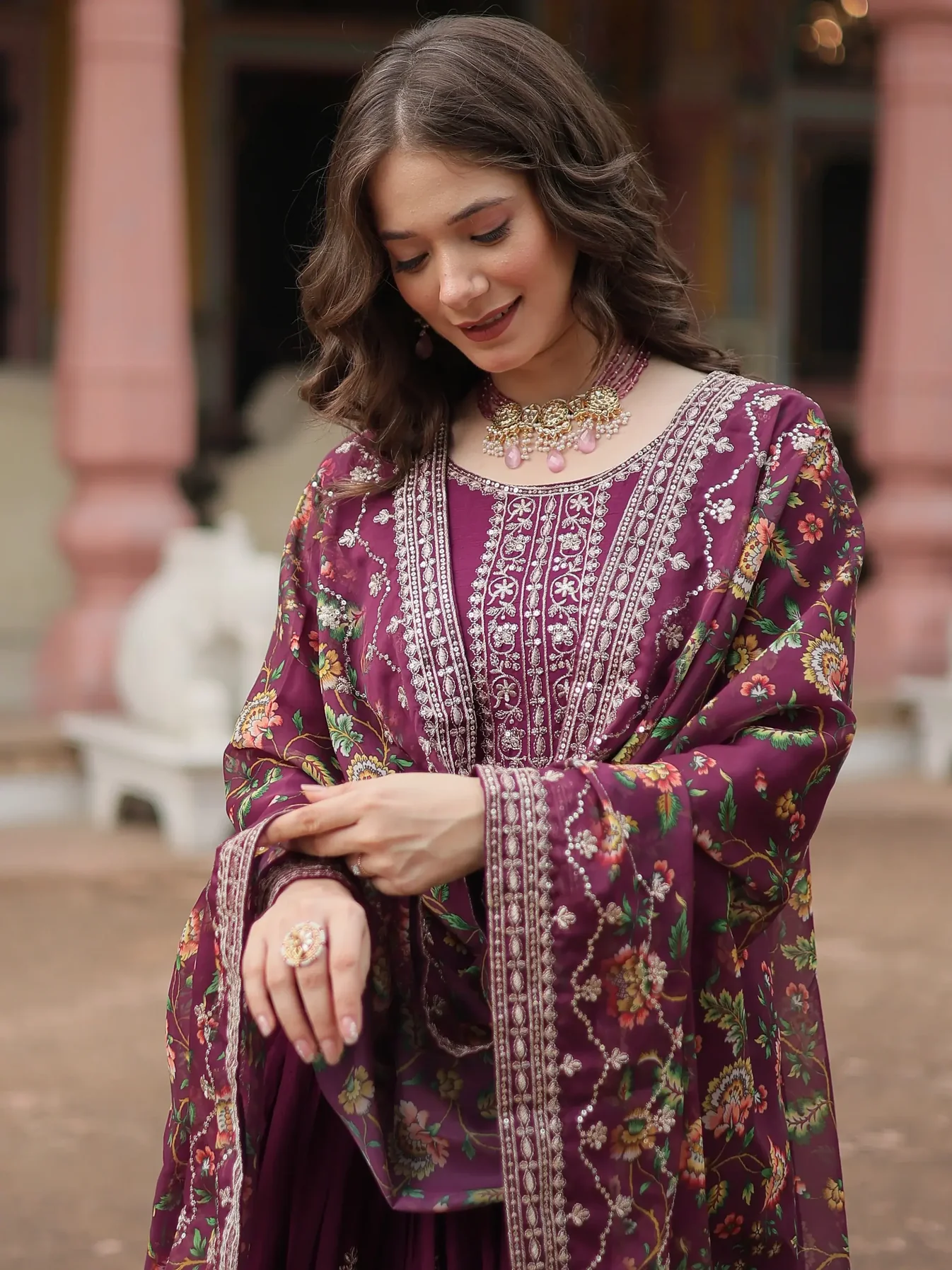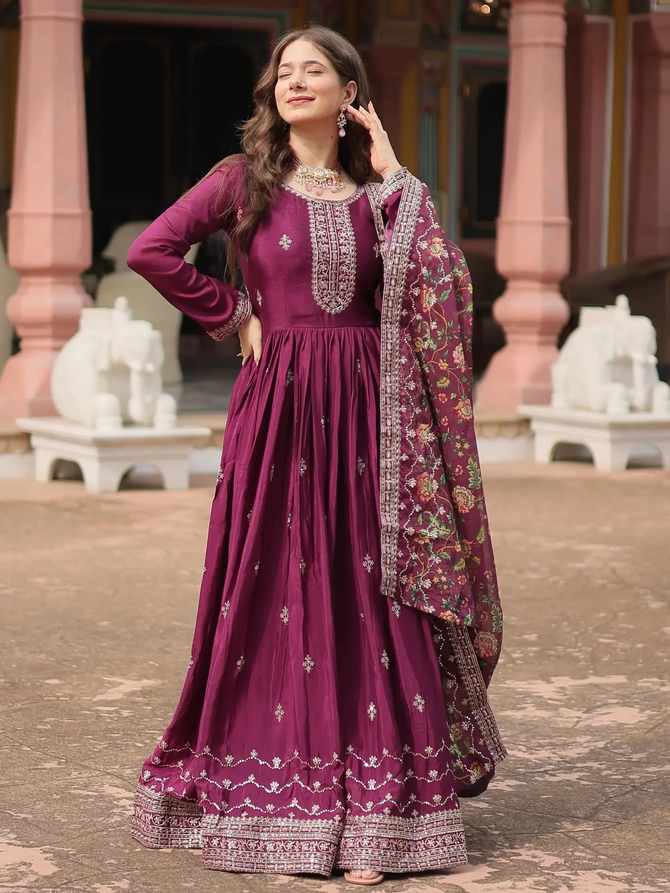 • Indulge in luxury with this stunning wine-colored chinon gown, featuring exquisite embroidery and shimmering sequin work.