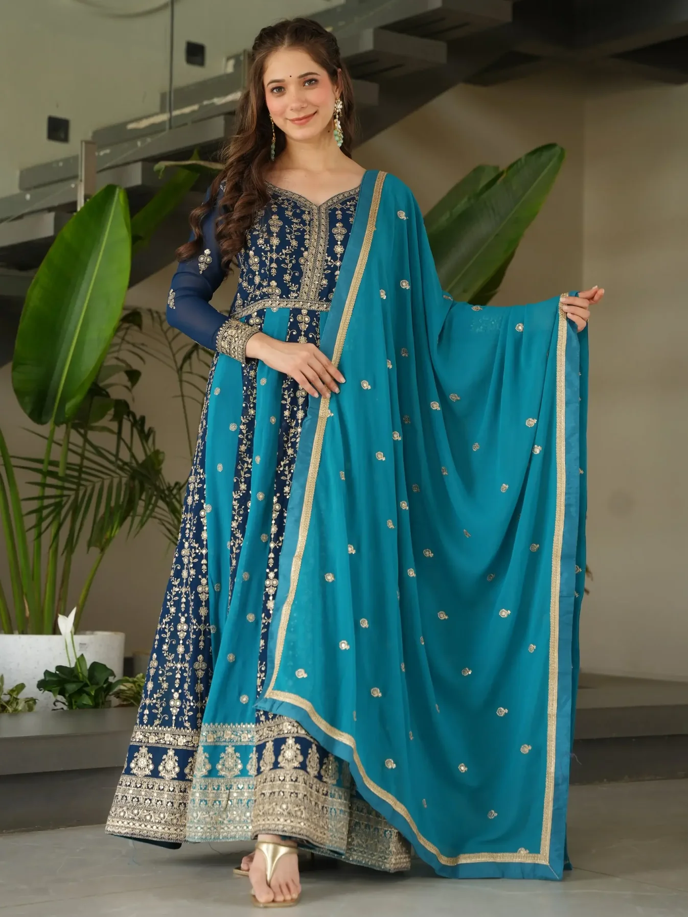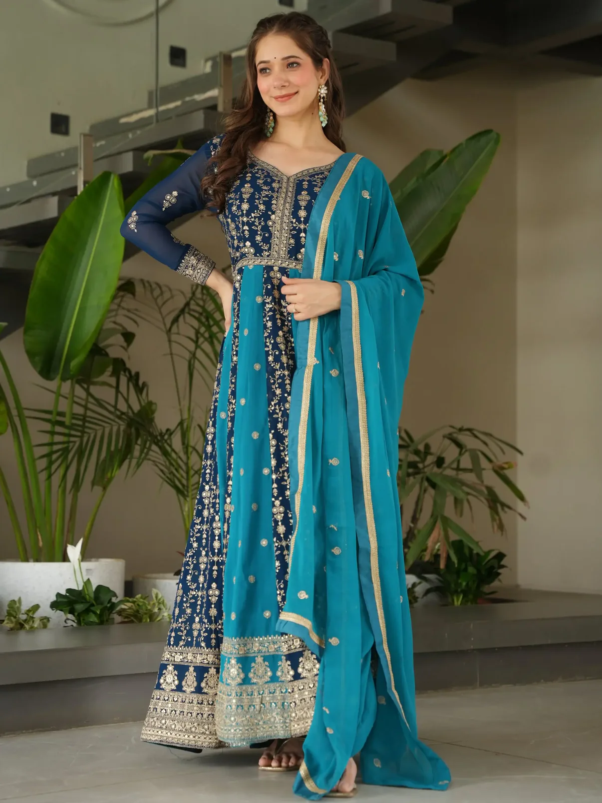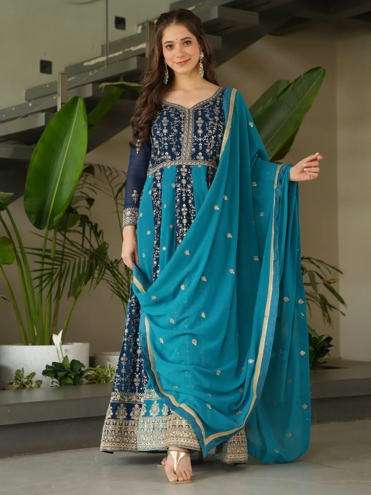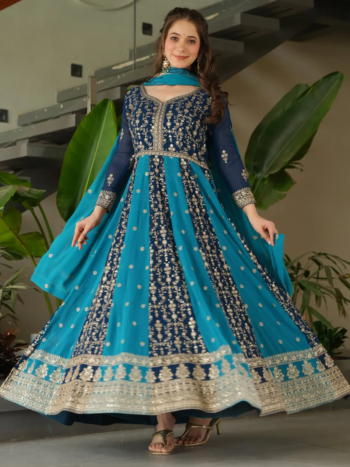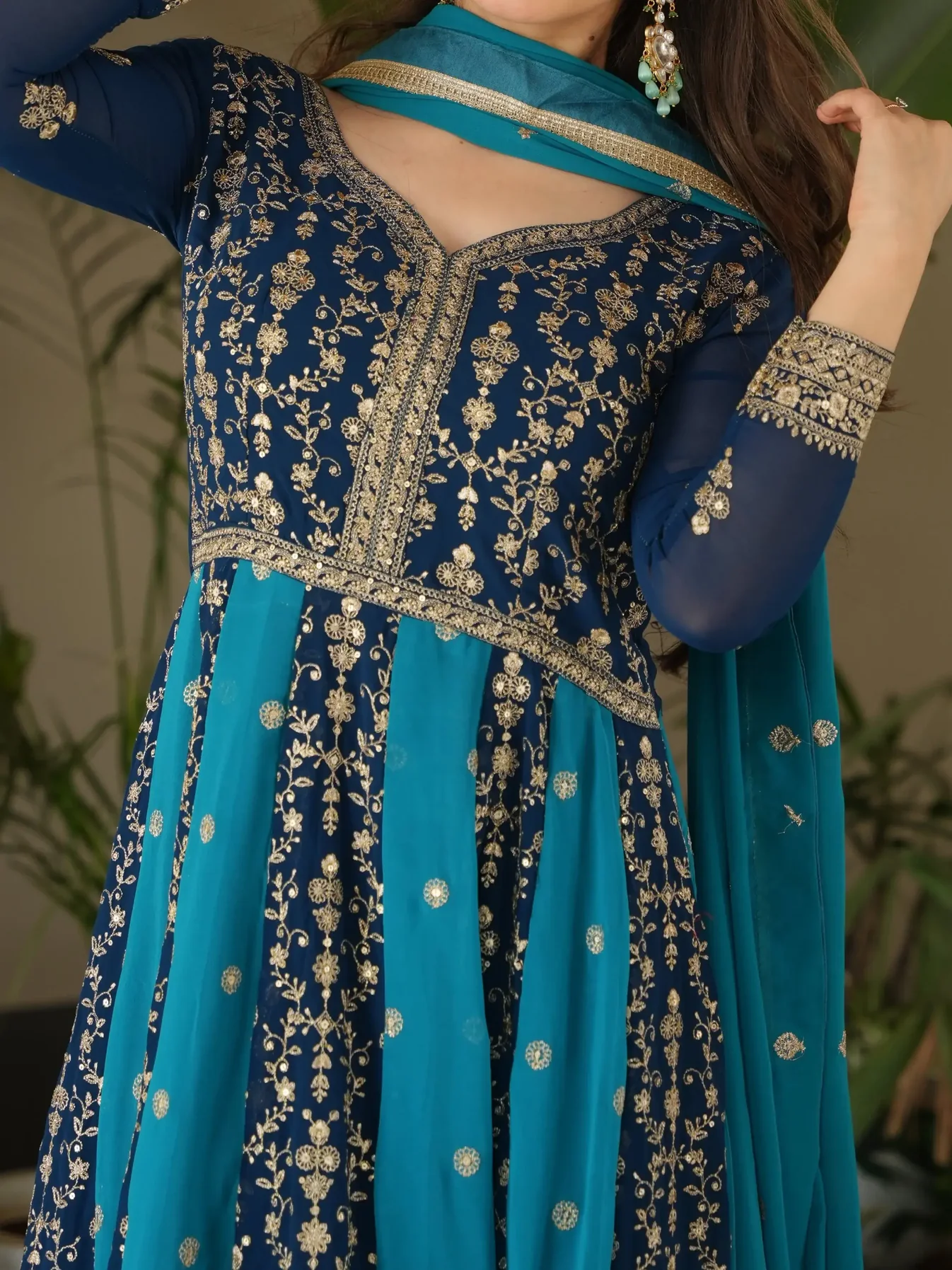 • This teal blue georgette gown features shimmering sequins and zari embroidery, giving it a rich and elegant look. The soft fabric flows beautifully, perfect for weddings and festive events.