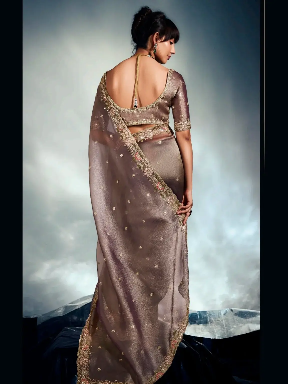 - Look stunning in this noteworthy brown organza reception wear saree, exquisitely decorated with lustrous moti, sparkling cutdana, shimmering sequins, and detailed khatli embroidery work.