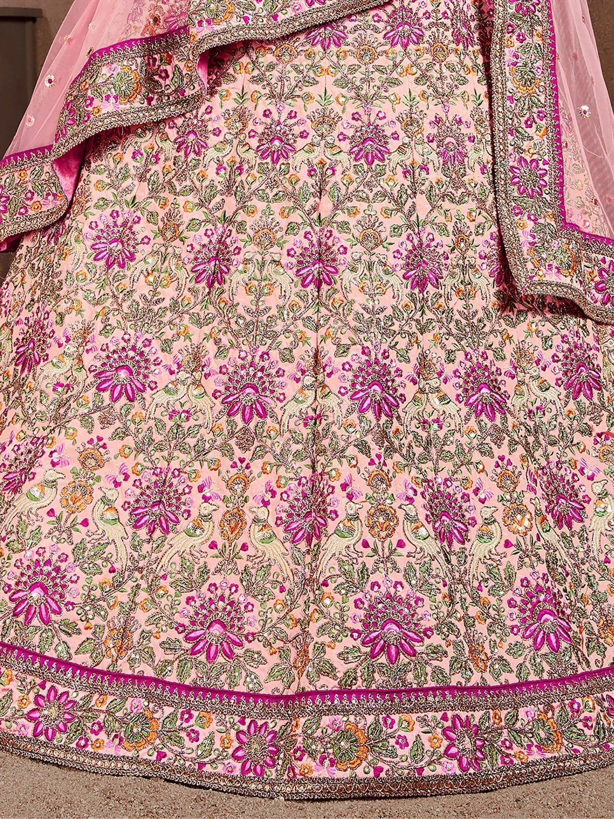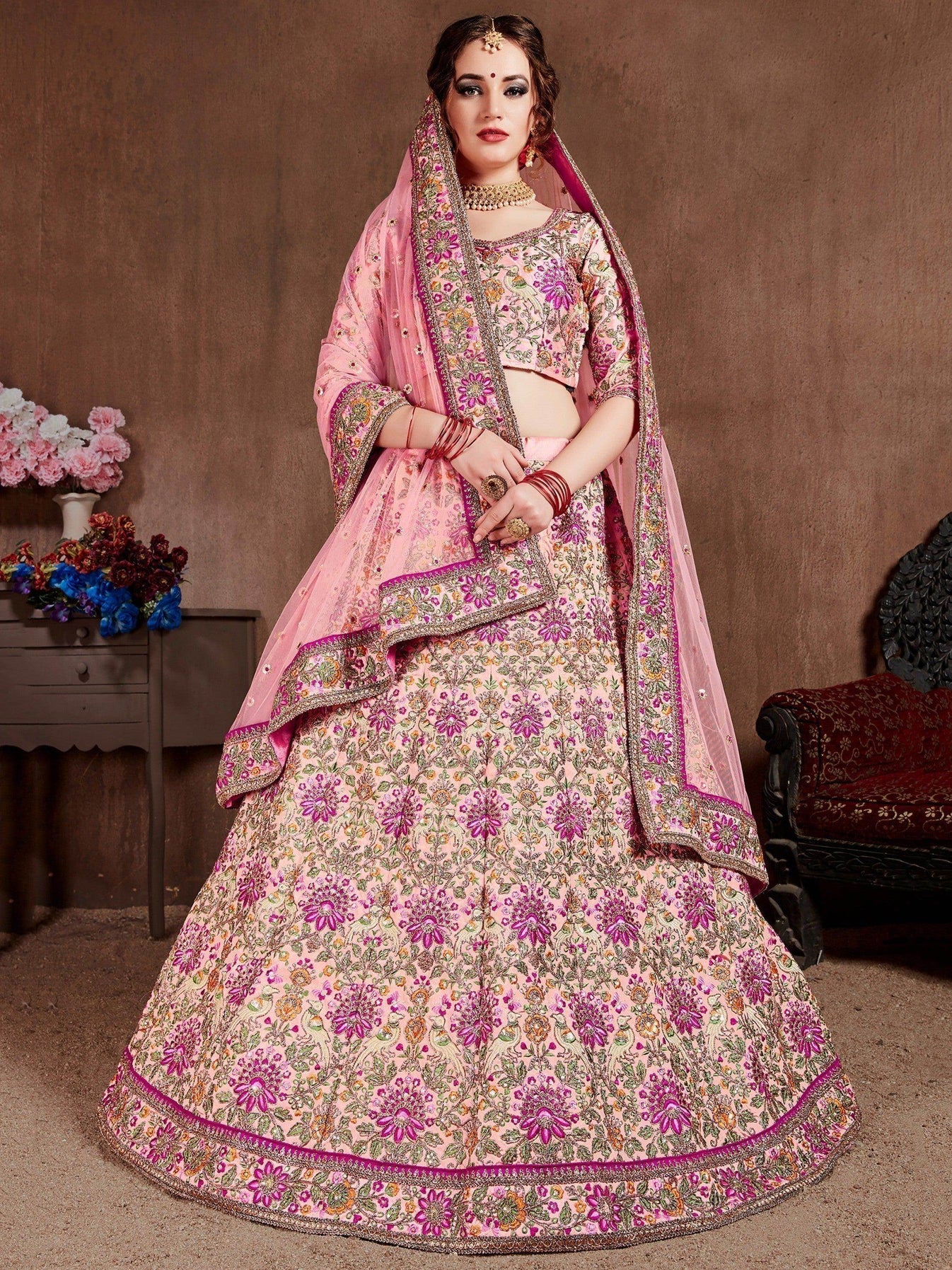 - We are introducing our prominent peach-colored bridal wear embroidered lehenga choli. This stunning lehenga features intricate dori work, zari work, and thread embroidery on a premium peach color taffeta silk material.