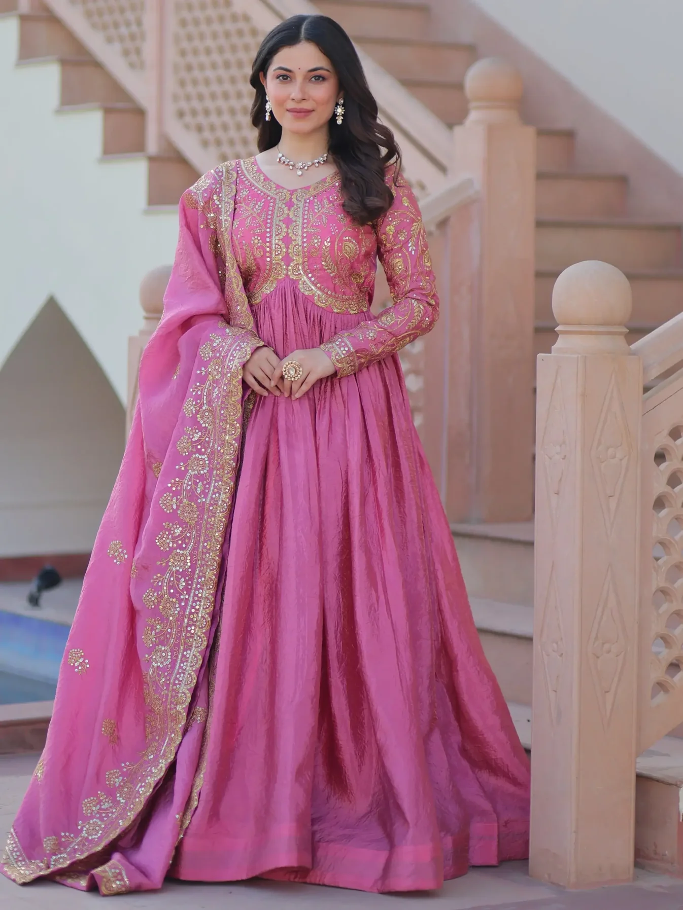 • Perfect for party and wedding functions, this gown blends romantic tones with festive detailing for a stunning appearance.
